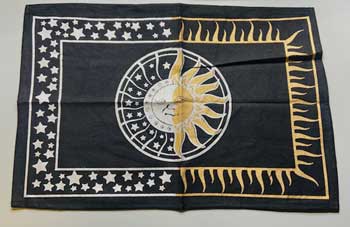 This is an altar cloth with two different interlinking Sun designs. The sun represents the masculine energy with firmness, strength, and power. Silver and gold with a black background. Sizes and shapes may vary slightly from piece to piece.